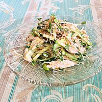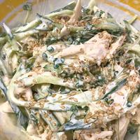 むね肉で作りました。簡単に出来るごまマヨドレッシングが美味しいです。すりごま多めで。作ってから食べるまでの時間が空いてしまう場合はきゅうりは塩揉みするといいでしょうね。