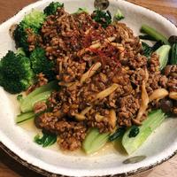 - 6 豚ひき肉の色が変わったら紹興酒を加えて中火でさっと炒めます。汁気がなくなったら、4、1のしめじを加えて5分程煮ます。