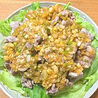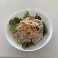 小ネギが無かった為省き、豚ロース→豚こまで代用、ロメインレタス→普通のレタスで代用し、食べ易い様に一口サイズに千切り敷きました。