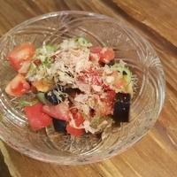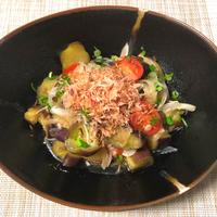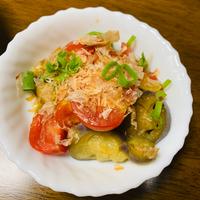 ゆでたナスを冷やしてトマトと和え、さっぱりとポン酢で味をつけて仕上げました。小ねぎとかつお節も効いて、簡単に作れておいしい一品です。さっと作れてしまいますので、もう一品欲しいときにいかがでしょうか。