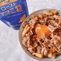 香ばしいローストアマニ粒がアクセントになった、ご飯が進む豚丼です。甘辛いタレと豚肉の相性は抜群で、温泉卵をのせると、まろやかな味わいに。タマネギやピーマン、人参など野菜を加えてボリュームアップするのもおすすめ。ザクザクした食感と芳ばしい香りが特徴のアマニ粒は、ゴマより大きめでナッツのような味わい。作り方も簡単で、家族みんなに好評の一品です。