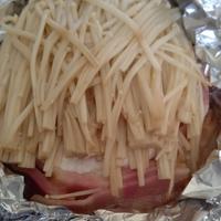 半量で、チーズは上に乗せて耐熱皿にホイルを被せて焼きました。