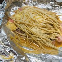 - 3 アルミホイルにカマンベールチーズ、2、1、(A)をのせて包み、天板にのせてオーブントースターでえのきに火が通るまで10分程加熱します。