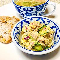 スーパーで“ ポテトサバダ”というのを見つけ、作ってみたくなりました。彩りにきゅうりの塩もみ足しました。おいしい!買わなくてもカンタンにできる!
