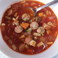 冷蔵庫の余った野菜とウインナーを組み合わせて、スパイスのきいたトマトスープを作りました。ごぼうの風味がきいているので、ごぼう好きの方にはピッタリのひと品です。いろいろな野菜を組み合わせてアレンジしてくださいね。