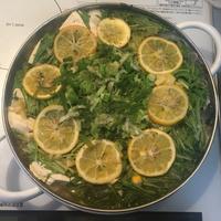 - 7 アクがでてきたら取り、2、4を入れ、1のレモンの輪切りを並べて、3を入れ蓋をし、3分ほど煮ます。