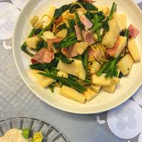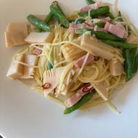 タケノコ、菜の花で、春を感じるパスタでした。醤油が入っているので、普通のペペロンチーノよりも和食感がありました。また、春に作りたいです。