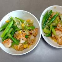 いつも買っていたホタテがまさかの品切れ。代わりにえび130g、アスパラ4本、長ねぎ1/3、にんにく一掛け調味料規定量で作ってみました。ホタテもよいけど、えびもなかなかおいしくできたので、結果オーライです!2022/12/13