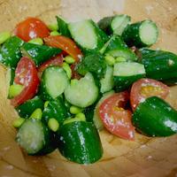 時間のない時でもさっと仕上がり重宝する、きゅうりとトマトの塩麹合えです。枝豆のアクセントも抜群!色鮮やかで見た目も優れた一品です。味付けは塩麹だけとは思えないおいしさです。超簡単レシピですので、是非お試し下さい。