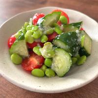 - 準備 きゅうりは両端を切り落としておきます。 トマトはヘタを取っておきます。 枝豆はパッケージの表記に従って解凍し、薄皮を取り除いておきます。