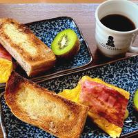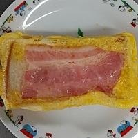 ベーコンは縮まないように両面焼かず、すぐパンを置いて卵液流した。