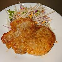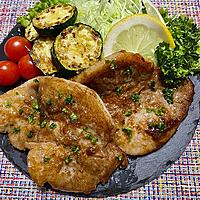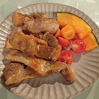 - 2 豚肉の両面に軽く塩胡椒して小麦粉をまぶしたら、サラダ油を熱したフライパンで両面にこんがりと焼き色がつくまで中火でソテーし、最後に醤油を回し入れて火を止めます。