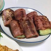 手前がきゅうりのベーコン巻きマヨ炒めです。