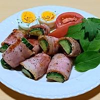 - 2 薄切りハーフベーコンに1をのせて巻きます。