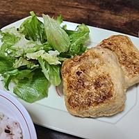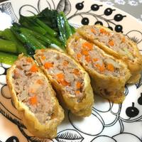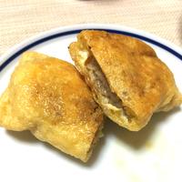 油揚げの中にメンチカツの肉だねを包んで焼き上げました。油揚げを衣代わりにしてますので、パン粉とは違った食感が味わえます。中にチーズを入れてますので、旨味が増しておいしいです。是非お試しくださいね。