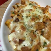 - 5 耐熱皿に入れ、ピザ用チーズをかけ、200℃のオーブントースターで10分程、チーズに焼き色が付くまで加熱します。