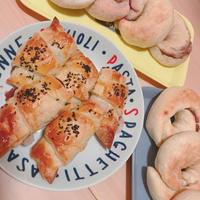 - 5 4につぶあんと1を乗せて巻き、天板の上に並べて溶き卵を塗り、黒いりごまを乗せて200℃のオーブンで20分焼きます。