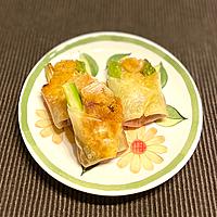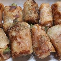 シュウマイの皮二枚の間にケチャップと生バジルを挟み、アスパラガスとブラックペッパー入ベビーチーズを包み、揚げ焼きにしました。ビールのつまみに最高です❣️