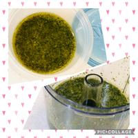 - 1 大葉、ナッツ、にんにくとオリーブオイル半分をフードプロセッサーにかけます。