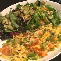 - 5 フライパンを中火で熱してサラダ油をひき、4を流しいれ混ぜます。卵がかたまってきたら、ヘラでおりたたむようにして形を整えます。
