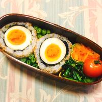 - 2 煮卵にのりを巻いて包みます。