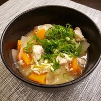 - 4 鍋に1と水を入れて中火で加熱します。大根とにんじんに火が通ったら顆粒和風だし、2、3を入れて、さらに5分程加熱します。