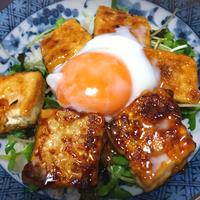豆腐の甘辛丼のご紹介です。豆腐をこんがり焼いて、甘辛いたれを馴染ませることでごはんとの相性は抜群です。しっかりめの味付けにまろやかな温泉卵がよく合いますよ。忙しいときでもぱぱっとお作りいただけますのでぜひ試してみてくださいね!