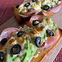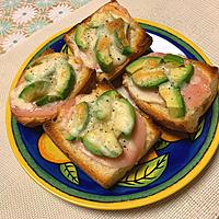 - 3 バケットの切り口にマヨネーズを塗り、生ハム、アボカドをのせチーズものせて黒こしょうをふり、アルミホイルを敷いた天板にのせオーブントースターで5分程焼きます。