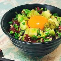マグロとアボカドの相性抜群な組み合わせに、ゆず胡椒のピリッとした辛味が絶妙なアクセントを添えています。マグロは漬け込むことでもっちりとした食感に変化し、醤油の旨みが程よく染み込みます。アボカドの濃厚さと、ごま油の香ばしい風味が調和して、ご飯がどんどん進む一品です。玉ねぎやかいわれ大根、大葉などお好みの具材を加えることで、さらに味わい深い丼に仕上がります。