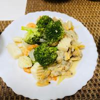 - 7 シーフードミックスに火が通ったら(A)を入れて中火で炒め合わせます。