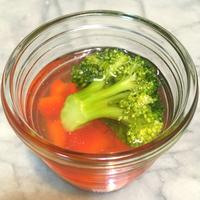 蒸し野菜があまっていたので挑戦。赤黄パプリカ・ズッキーニ・マッシュルームで作りました。コンソメは400ml分です。ゼラチンなかったので、寒天を使用。コンソメ分量どうりに作りましたが、冷やすと薄味に感じるので、次回は塩を気持ち多めにしたいです。華やかな一品!