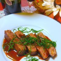 甘めのソースにわさびの風味が効いた贅沢なステーキソースです。ソースは赤ワイン、みりん、はちみつなどで作られ、最後にわさびを加えることで味が決まります。お好みでわさびを多めに、はちみつを控えめにアレンジすることで、ツーンとした大人の味わいに仕上がります。お肉は5分ほどアルミホイルで休ませることで、ジューシーなミディアムレアに。まるでレストランのような味わいを簡単に楽しめます。