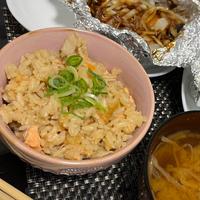 米2合 だし汁360ml 酒大さじ1醤油大さじ1.5で。舞茸1パック、生鮭に少し塩を振り、フライパンで焼き目を付けてから炊飯器へ。味が薄いように感じたのでバターと醤油を追加しましたがイマイチな感じでした。