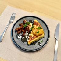 - 15 器に14の半量を盛り付け、9の半量をのせてソースをかけます。