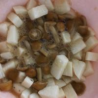- 1 鍋にお湯を入れ沸騰したら、なめこを入れ、1分程ゆで、湯切りし、粗熱を取ります。