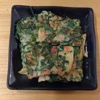 春菊と香ばしい釜揚げ桜エビのちょっと和風なチヂミです。春菊のほんのりとした苦味が大人の味でハマりそうです。釜揚げ桜エビの代わりに釜揚げしらすもとてもオススメです。タレはポン酢以外にお好みのもので大丈夫です。