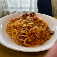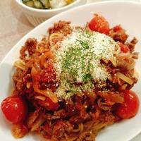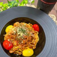 牛肉の旨みとトマトソースの相性が抜群で、ワインの風味が加わることでお店のような上品な味わいに仕上がります。ミニトマトはシャキシャキ感を残すように最後にサッと混ぜ込むのがポイント。コンソメと砂糖で酸味を調整し、粉チーズをたっぷりかけると本格的な味わいに。舞茸を加えたりアレンジも楽しめる、ボリューム満点の簡単パスタレシピです。
