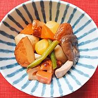 - 5 (A)を入れ、沸騰したら栗の甘露煮、2を入れ落とし蓋をして、にんじんが柔らかくなるまで中火で煮ます。