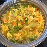 - 2 鍋に水を入れて中火で加熱し、沸騰したら1を入れて煮ます。しんなりしたら(A)を入れて混ぜ、溶き卵を回し入れて1分ほど煮ます。