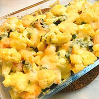大きめカリフラワー丸ごと一個、チーズ倍量、エビ12匹ぐらい追加しました。カリフラワーは一口大より大きめにカットしたので3分チンで硬いけどオーブンしたら柔くなるかと思ったけどならず。次回気を付けたし。