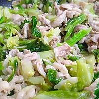 - 2 フライパンにサラダ油を入れ中火で加熱し、豚こま切れ肉を入れ炒めます。色が変わったら1を入れ炒めます。