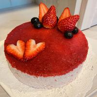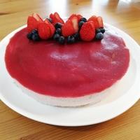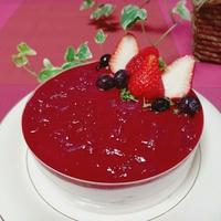 真っ赤なゼリーをのせたムースケーキのご紹介です。ムースには、いちごをたっぷりと使った甘いムースに仕上げ、ラズベリーゼリーの甘酸っぱさとよく合います。ふわふわのビスキュイ生地を土台と中央に入れ断面もお楽しみいただけます。クリスマスや、お誕生日のケーキにいかがでしょうか。