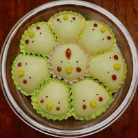 - 5 竹串で刺して何もついてこなければ蒸しあがりです。黒ごま、コーン缶、ケチャップでトリのデコレーションをして完成です。
