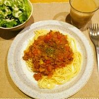 セロリの代わりにブロッコリーの茎をみじん切りにして使ってみました。トマト缶は1缶使いきりたかったので、挽き肉は200グラム固形ブイヨンは2個に増やしました。