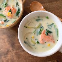サーモンとほうれん草のクリームシチューをご紹介します。サーモンの旨みが牛乳やバターのコクとよく合う一品です。ルーを使わず手軽に作れるので、ぜひお試しくださいね。