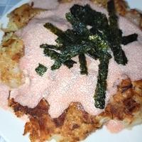 たっぷりの切り餅を混ぜ込んで作ったお好み焼きに、明太子ソースをかけました。もちもちとした食感の生地に、明太子のソースがとてもよく合います。ぜひお試しください。