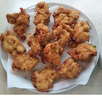 - 3 鍋の底から3cm程の揚げ油を注ぎ入れ、180℃に加熱し、2をスプーンで一口大にすくい入れます。全体がきつね色になり、中に火が通るまで5分程揚げ、油を切ります。
