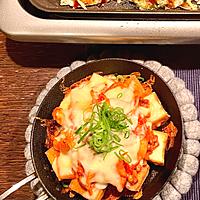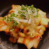- 4 キムチ、2、ピザ用チーズの順にのせ、アルミホイルをかぶせ、弱火で5分程蒸し焼きにします。