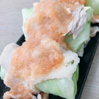 おろし明太ポン酢のレタス肉巻きのレシピの紹介です。レタスを折りたたむことで、豚肩ロースを巻くことが簡単にできます。明太子の塩気とさっぱりとしたおろしポン酢がレタス巻きによく合います。レンジで簡単に作れるので、ぜひ作ってみてくださいね。