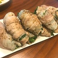 - 4 豚肩ロースを2枚並べ、3をのせて巻きつけます。同様に9個作ります。